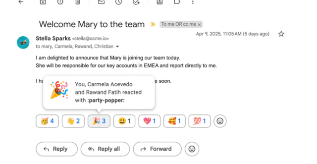O Google lançou reações emoji para contas pessoais do Gmail há cerca de dois anos, e eu tinha esquecido completamente delas até agora – provavelmente porque a opção estava escondida dentro do pequeno ícone de carinha sorridente na lateral Prosseguir botão. Mas agora, Google traz reações emoji para todos os usuários do Workspace por padrão em 9 de fevereiro, lembrando-me de sua existência (e sempre posso responder com um “polegar para cima” em vez da mensagem completa).