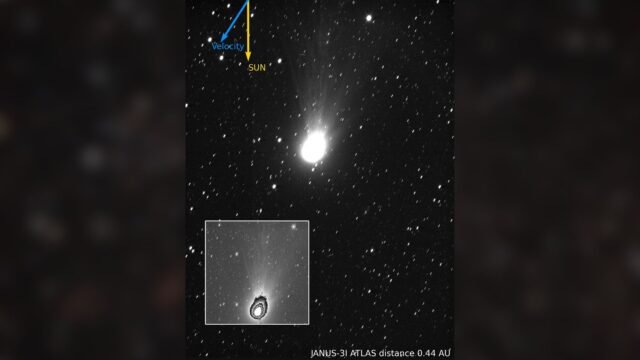 A sonda JUICE da Agência Espacial Europeia obteve a primeira imagem detalhada do cometa interestelar 3I/ATLAS, capturando a coma brilhante e a cauda extensa. (Fonte da imagem: ESA/Juice/JANUS)
