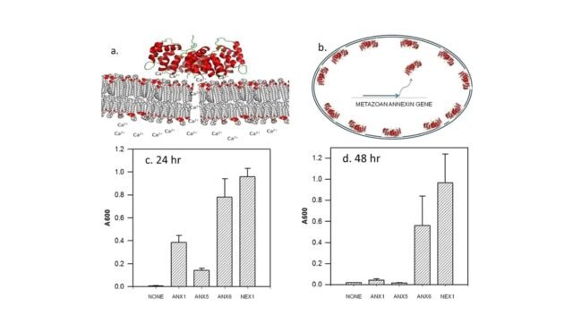 Parte c. Na presença de 2% de isobutanol, a produção de anexina aumenta a viabilidade da levedura. O crescimento de levedura é detectado medindo a turbidez (turbidez) da cultura de levedura usando um espectrofotômetro (medido em unidades de absorção – abreviado como A600). Após 24 horas em isobutanol, se não for produzida anexina (“nenhuma”), não será observado crescimento de células de levedura. As células de levedura crescem significativamente se uma das três anexinas humanas (ANX1, ANX2 ou ANX6) ou helmintos (nematóides) for produzida Anexina (NEX1).
