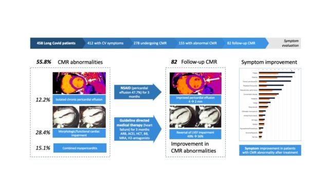 Mais da metade dos pacientes apresentaram sinais de problemas cardíacos nesses exames. Isso inclui um acúmulo de líquido ao redor do coração chamado derrame pericárdico, que é um acúmulo de líquido no saco ao redor do coração que pode afetar sua função. A função cardíaca também diminui e desenvolve-se uma condição chamada miopericardite, que envolve inflamação do músculo cardíaco e das membranas circundantes. Muitos pacientes também relatam desconforto torácico persistente e dificuldade nas atividades físicas diárias.