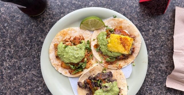Tacos Chukis me é familiar, mas nunca fui. Quase passei pelo local, pois ficava nos fundos de um prédio com meia dúzia de outras lojas de varejo e sem sinalização na calçada. Mas Gêmeos me indicou o lugar certo e na hora certa: o restaurante só abriu 15 minutos antes de eu entrar. Meu itinerário de IA sugeria que a especialidade da casa com abacaxi grelhado era uma escolha popular, e eu sabia por quê. Três deliciosos tacos depois, era hora de seguir para minha próxima parada.