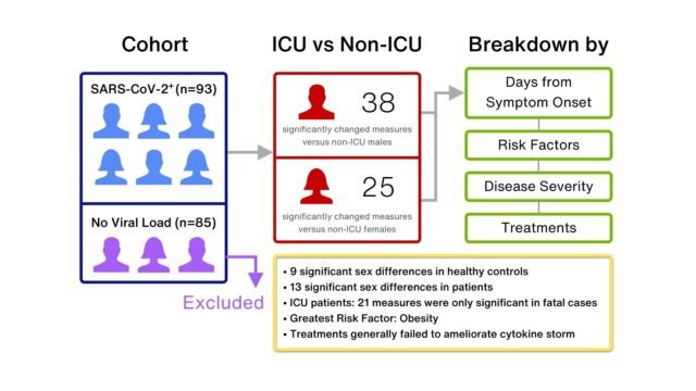 O estudo, publicado na revista Cells, destaca o papel crítico de uma resposta imunológica hiperativa conhecida como tempestade de citocinas em pacientes com COVID-19 grave. Os investigadores descobriram que os homens na unidade de cuidados intensivos apresentaram alterações mais significativas do que as mulheres no seu sistema imunitário e na saúde geral, com um grande número de factores que analisaram mostrando diferenças claras entre os sexos. Uma das descobertas mais surpreendentes foi que os pacientes que não sobreviveram apresentavam níveis mais elevados de certas células do sistema imunológico, como células T GzB + CD8 + produtoras de granzima B, CD8Temra e um subconjunto de citocinas, como interferon-gama (IFN-γ), interleucina-2 (IL-2) e IL-1α. Esses números de células imunológicas e níveis de citocinas foram menos evidentes em pacientes recuperados. Esta diferença é particularmente pronunciada quando se comparam homens e mulheres, destacando a complexa interação entre o sexo biológico, a resposta imunitária e a gravidade dos resultados da doença.