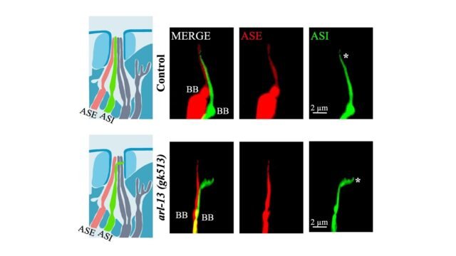 Abaixo da superfície do minúsculo verme transparente Caenorhabditis elegans, os pesquisadores descobriram novas pistas sobre como certas estruturas semelhantes a cabelos nas células, chamadas cílios, crescem de maneira sincronizada. Os cílios são pequenas projeções que ajudam as células a sentir o ambiente e a movimentar materiais. Essas estruturas ajudam o verme a detectar seu ambiente e geralmente crescem lado a lado em pares. Como esses pares permanecem consistentes à medida que crescem tem sido um mistério até agora. Os cientistas compreendem agora que uma proteína chamada ARL13B, envolvida na organização e sinalização destas estruturas, desempenha um papel fundamental na gestão deste crescimento lado a lado, um padrão que descrevem como “alongamento cílios-cílios justapostos”, o que significa que dois cílios adjacentes crescem em sincronia um com o outro.