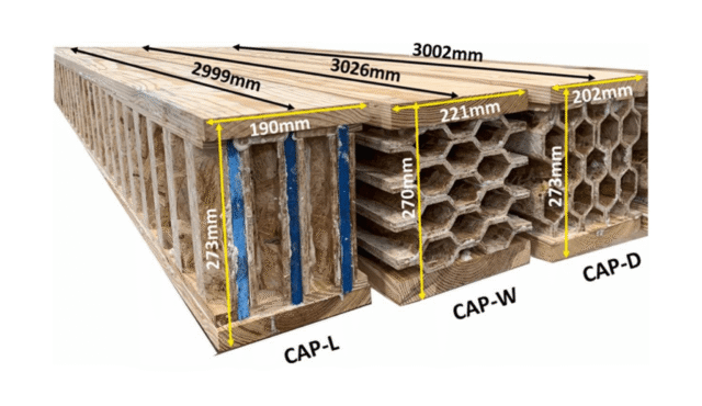 Em diferentes configurações de núcleo, a orientação dos painéis corrugados internos desempenha um papel crítico no desempenho. Alguns layouts resultam em menor resistência à flexão, enquanto outros aumentam significativamente a rigidez e a eficiência de transporte de carga. A capacidade de carga refere-se à capacidade de uma estrutura suportar peso sem falhar. Uma configuração (chamada CAP-D na imagem acima) em que as ondulações estão alinhadas com a profundidade da viga atinge o melhor equilíbrio entre resistência e propriedades de leveza. Estas descobertas demonstram que a geometria interna, e não apenas as matérias-primas, pode influenciar fortemente a forma como uma estrutura responde às forças aplicadas.
