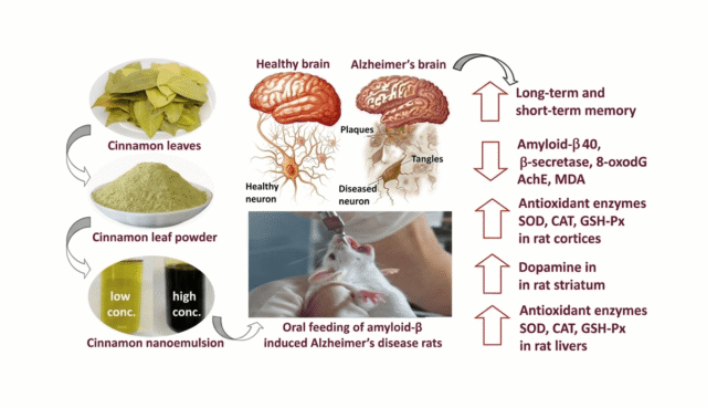 Para testar se a fórmula poderia proteger a memória e a função cerebral, Chen e sua equipe causaram danos semelhantes aos do Alzheimer em ratos ao introduzir amiloide, um fragmento de proteína que pode se agrupar para formar placas no cérebro. A memória e a aprendizagem dos animais foram avaliadas através do labirinto aquático de Morris, um teste comportamental amplamente utilizado no qual os ratos devem aprender a usar pistas espaciais do seu entorno para encontrar uma plataforma escondida numa piscina de água. O professor Chen disse: “O teste do labirinto aquático de Morris mostrou que o tratamento com nanoemulsão com extrato de folha de canela foi o mais eficaz na melhoria da memória de curto prazo, memória de longo prazo e resultados de testes de detecção espacial de ratos com Alzheimer, seguido por extrato de folha de canela, hidrossol em pó e pó de água. ” Os ratos que receberam doses mais elevadas de nanoemulsão tiveram um desempenho quase tão bom quanto os ratos saudáveis, mostrando melhorias significativas em comparação com animais não tratados.