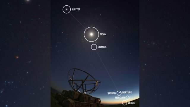 Drury, um astrofotógrafo experiente, disse que até mesmo achou um desafio capturar todos esses planetas. “Devido à escala do Desfile dos Planetas, o enquadramento foi desafiador”, disse ele, exigindo que ele usasse sua lente para capturar quase 180 graus do céu.