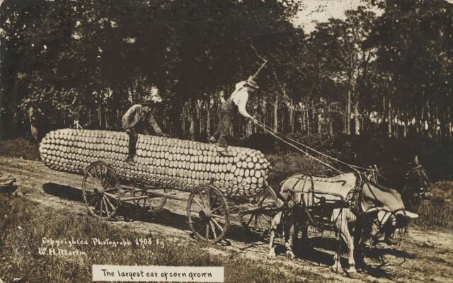 Tire esta foto impressionante de uma enorme espiga de milho (acima). Esta fotografia foi tirada – ou talvez mais precisamente feita – por WH Martin em 1908 como parte de uma série de cartões postais representando culturas ou gado de tamanhos estranhos. Martinho fotografe cada elemento cena, cortando e colando as fotos antes de refazer novas imagens.