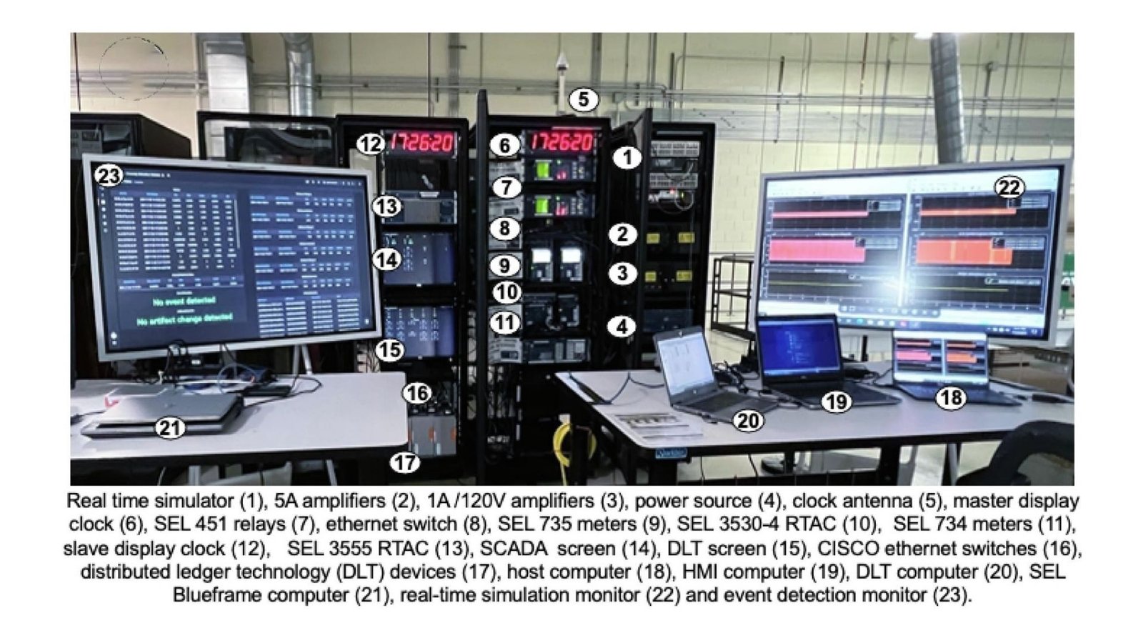 Figura 1: O sistema Cyber ​​​​Grid Guard do Laboratório Nacional de Proteção Avançada de Oak Ridge protege uma bancada de teste de rede de subestação. Conforme mostrado na figura: (1) Simulador em tempo real; (2) amplificador 5A; (3) amplificador 1A/120V; (4) Fonte de alimentação; (5) Antena de relógio; (6) Relógio do display principal; (7) Relé SEL-451 da Schweitzer Engineering Laboratories, Inc. (SEL); (8) Comutador Ethernet; (9) medidor SEL-735; (10) Controlador de Automação em Tempo Real SEL-3530-4 (RTAC); (11) medidores SEL-734; (12) Relógio do display secundário; (13) RTAC SEL-3555; (14) Tela de monitoramento e coleta de dados; (15) Tela Distributed Ledger Technology (DLT); (16) Comutador Ethernet CISCO; (17) equipamento DLT; (18) Computador host; (19) Computador com interface homem-máquina; (20) Computador de contabilidade distribuído; (21) Computador SEL Blueframe; (22) Monitoramento de simulação em tempo real; (23) Monitor de detecção de eventos.