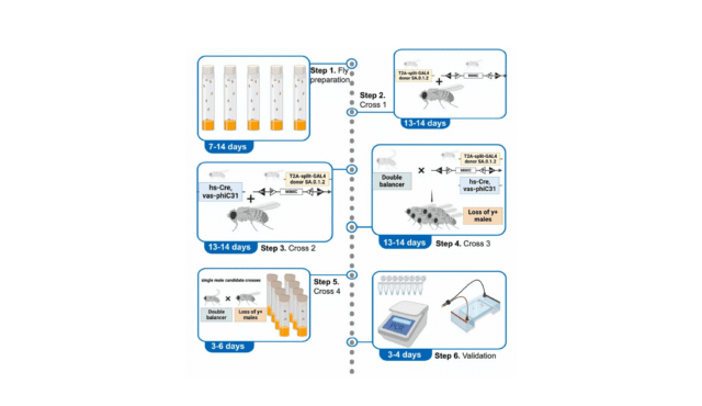Pesquisadores da Universidade de Nova York desenvolveram um novo protocolo para usar hibridização genética para gerar linhas GAL4 divididas específicas do gene em Drosophila melanogaster (Drosophila melanogaster), que fornece uma alternativa econômica aos métodos tradicionais de microinjeção. A equipe, liderada pelo Dr. Yu-Chieh David Chen e incluindo Siqi April Li, Hongzhou Gustave Li, Nathalie Shoji e Dr. Claude Desplan, detalhou sua abordagem inovadora na revista STAR Protocols.