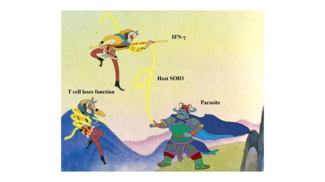 O parasita explora a ligação do hospedeiro SOD3 às células T, resultando na capacidade prejudicada das células T de se defenderem contra infecções patogênicas. O Sun Wukong representa células T citotóxicas, a corda de pano dourada representa o hospedeiro SOD3, o monstro representa parasitas e o aro dourado representa IFN-γ e outros fatores imunológicos eficazes. Os parasitas sequestram as células T do hospedeiro através da expressão elevada de SOD3, resultando em respostas imunológicas precoces prejudicadas à infecção parasitária.