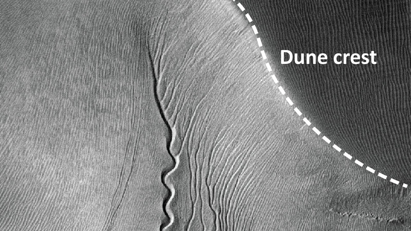 À medida que o gelo de dióxido de carbono derretia ao longo das dunas e soprava a areia, eles pareciam esculpir ravinas misteriosas em Marte – um processo que se parecia muito com as tocas fictícias do verme da areia no filme “Duna”.