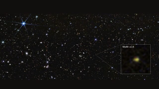 A galáxia, chamada MoM-z14, oferece um raro vislumbre do universo apenas 280 milhões de anos após o seu nascimento. Big Bang. A sua luz viajou cerca de 13,5 mil milhões de anos antes de chegar Terra, Tornando-a uma das galáxias mais distantes e antigas já observadas.