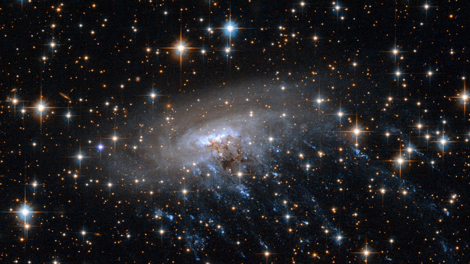 A imagem JWST da ESO 137-001 mostra um disco galáctico de aparência relativamente normal, não muito diferente das nossas galáxias modernas, exceto pelos óbvios rastos de gás. “Nós” azuis brilhantes podem ser vistos nessas gavinhas, que representam grupos de estrelas jovens.