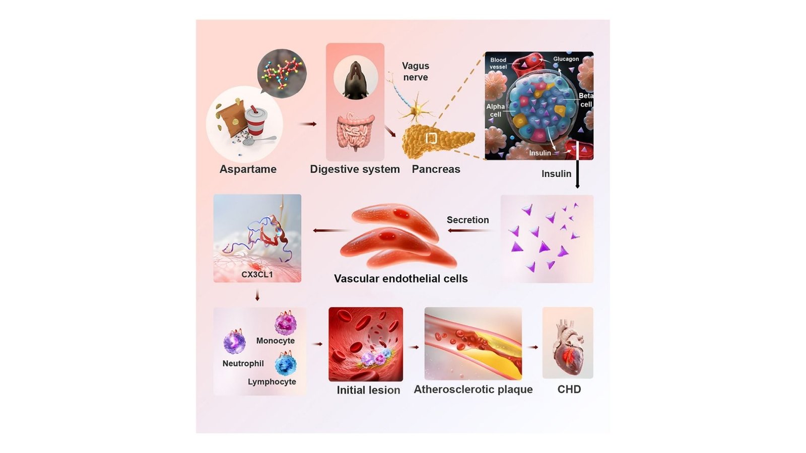 A equipe descobriu que a ingestão de aspartame causou um aumento significativo nos níveis de insulina em ratos e macacos. O aumento da insulina não é causado por açúcar ou calorias, mas pela estimulação do sistema nervoso responsável pela digestão e relaxamento, conhecido como sistema nervoso parassimpático. Com o tempo, níveis elevados de insulina podem levar à resistência à insulina (o corpo já não responde bem à insulina e não consegue controlar eficazmente o açúcar no sangue) e promove o crescimento e enfraquecimento de placas de gordura nas artérias. Mesmo pequenas quantidades de aspartame foram suficientes para desencadear estes efeitos, com uma acumulação significativa de placas observada em semanas.