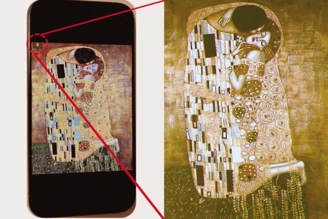 Gustav Klimt Beijo mostrado em um iPhone (esquerda), no qual é colocado um pequeno display de papel eletrônico com a mesma imagem (direita).