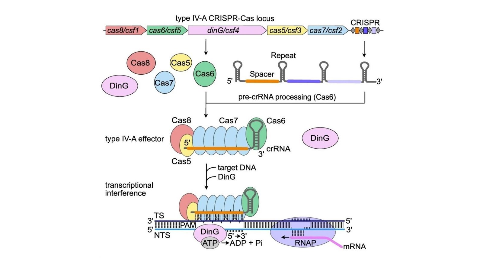 Ao contrário de outros sistemas CRISPR, que cortam o DNA para torná-lo inútil, o sistema Tipo IV-A funciona interrompendo o processo de conversão do material genético em moléculas de RNA, uma etapa necessária para produzir proteínas nas células. Este tipo de interferência é particularmente útil no controle da competição genética e na regulação de genes. Os cientistas concentraram-se em compreender como estes sistemas reconhecem alvos de ADN e introduzem uma proteína especial chamada DinG helicase, que desenrola a cadeia de ADN para que possa ser processada posteriormente para realizar a tarefa.