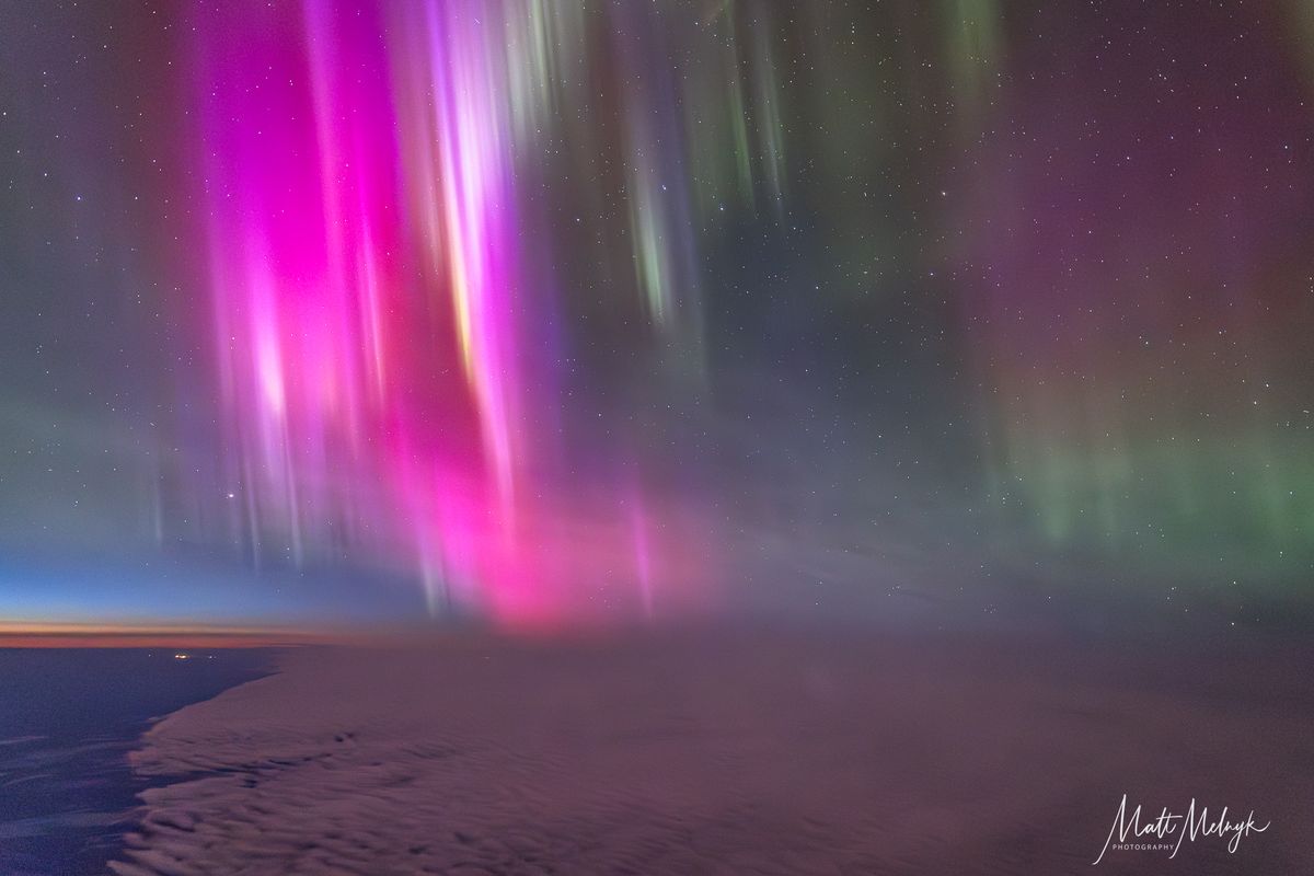 Matt Melnyk é um piloto de linha aérea e ávido caçador de auroras que regularmente gosta de exibir a aurora boreal enquanto navega a 36.000 pés.