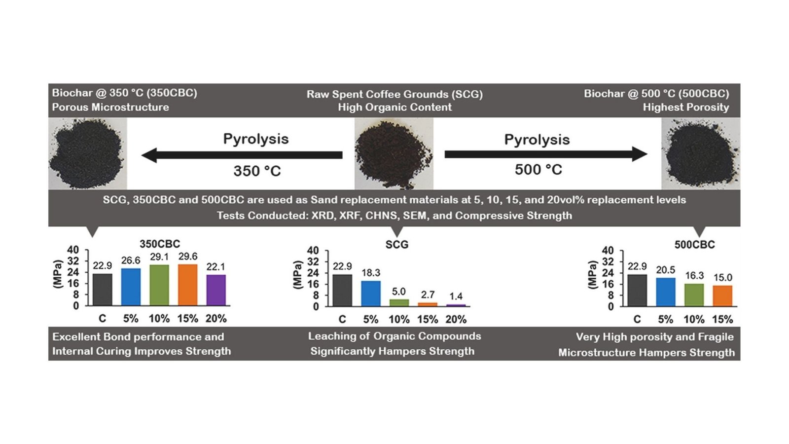 Em experimentos, os pesquisadores descobriram que usar borra de café não tratada diretamente no concreto não funcionava bem. Os compostos naturais do solo podem interferir no endurecimento do cimento, tornando o concreto mais fraco. No entanto, quando os grãos de café são aquecidos num ambiente livre de oxigénio (um processo chamado pirólise, que decompõe a matéria orgânica em formas estáveis ​​de carbono), os resultados são bastante diferentes. Adicionar quantidades adequadas deste material de café processado ao concreto pode aumentar significativamente sua resistência.