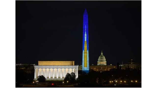 Um mês antes do lançamento, a “vela” do foguete Artemis 2 ilumina o Monumento a Washington, desencadeando a mania da lua em Washington (foto)