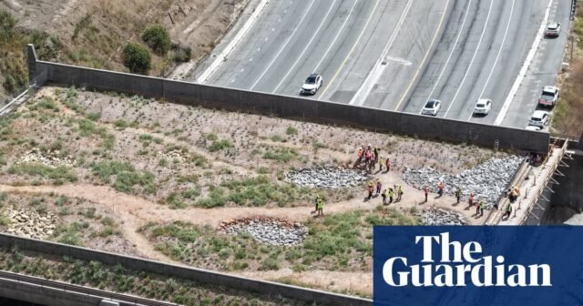 UM.Borboletas encheram o ar no topo de uma enorme ponte para vida selvagem na Califórnia esta semana. Um falcão de cauda vermelha sobrevoou enquanto uma brisa suave agitava 6.000 plantas nativas, incluindo papoulas e sálvia roxa. Você nunca imaginaria que sob a extensão tranquila de rochas e vegetação, uma rodovia de 10 pistas transporta 400 mil carros todos os dias.