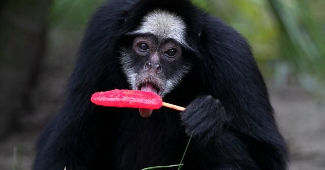 Os tratadores do zoológico distribuíram sorvete de melancia para um grupo de macacos. Uma onça tentou retirar picolés de frango moídos de uma bandeja que flutuava em uma caixa d’água.
