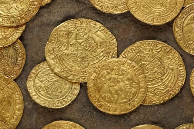 Para começar, o solo parecia conter finos painéis de metal. Mas quando o filho adolescente do casal lavou o pedaço de material debaixo do guindaste do jardim, a família percebeu que havia moedas de ouro presentes.