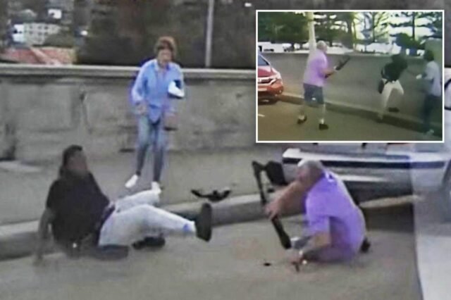 A filmagem mostra um atirador lutando contra um homem mais velho de camisa lilás e shorts por uma arma de cano, antes de ambos caírem pesadamente no chão na traseira de um carro hatchback prateado. JENNY via REUTERS