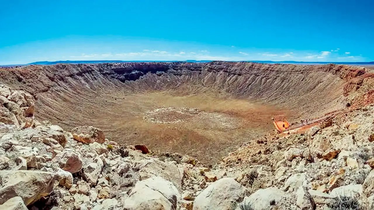 A formação inclinada em forma de tigela, com aproximadamente 2.950 pés de diâmetro, indica que foi formada após o impacto de um enorme asteróide (cerca de 100 pés de diâmetro).