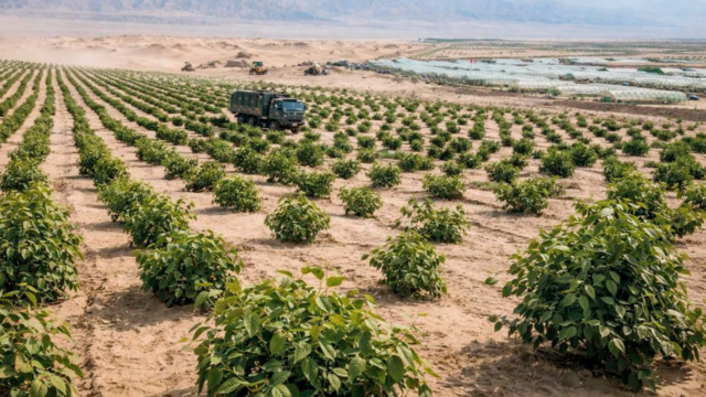 Pesquisadores chineses recorreram ao deserto de Gobi como campo de testes para árvores produtoras de borracha de alto valor. A borracha da fábrica de Duzhong provou ser particularmente valiosa para aplicações de defesa: adicionar apenas 3 a 5 por cento a um composto de borracha aumenta significativamente a durabilidade e a resistência ao desgaste de pneus de alto desempenho e resistentes a perfurações, enquanto o material também é usado em compósitos de blindagem eletromagnética. Até recentemente, o Duzhong era cultivado principalmente no centro e no sul da China.