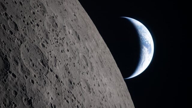 Em ambas as imagens, o horizonte desolado da Lua aparece em primeiro plano, ignorado pela Terra, cujo azul brilhante se destaca na vasta escuridão do espaço.
