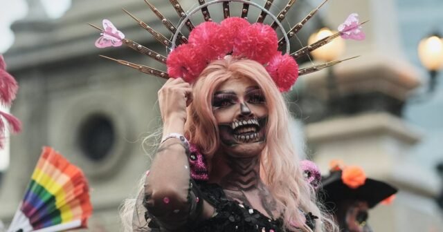 CIDADE DO MÉXICO (AP) – Usando um vestido rosa inspirado na arte popular mexicana com silhueta estilo sereia, o drag artist Ángel Arumir ajusta sua coroa de flores sobre sua peruca roxa enquanto entra em um mar de esqueletos.