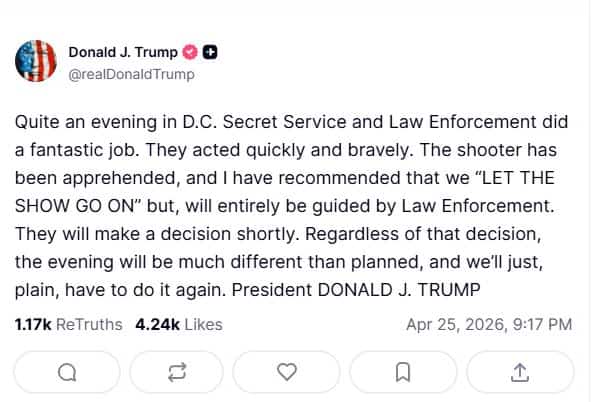“Esta não é a primeira vez nos últimos anos que a nossa República foi atacada por um suposto assassino que tentava matar”, disse Donald Trump numa conferência de imprensa na Casa Branca cerca de duas horas após o incidente, ainda vestindo smoking.