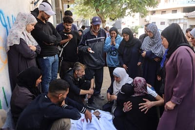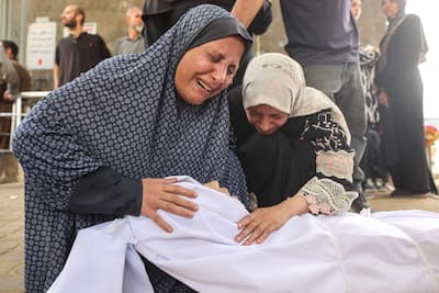 Mulheres, com os rostos cheios de dor, inclinam-se sobre pequenos corpos caídos no chão em Khan Younis, no sul da Faixa de Gaza, lamentando a morte de dois dos seus filhos durante uma nova vaga de ataques israelitas.