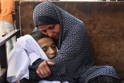 Outras imagens mostraram vários corpos, incluindo um embrulhado num saco plástico branco, levados ao hospital Nasser, lamentados por familiares. Vemos também crianças necessitadas de cuidados, como esta criança, com um curativo no braço e um médico examinando seu crânio.
