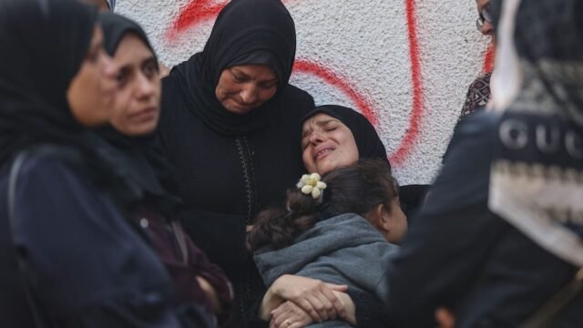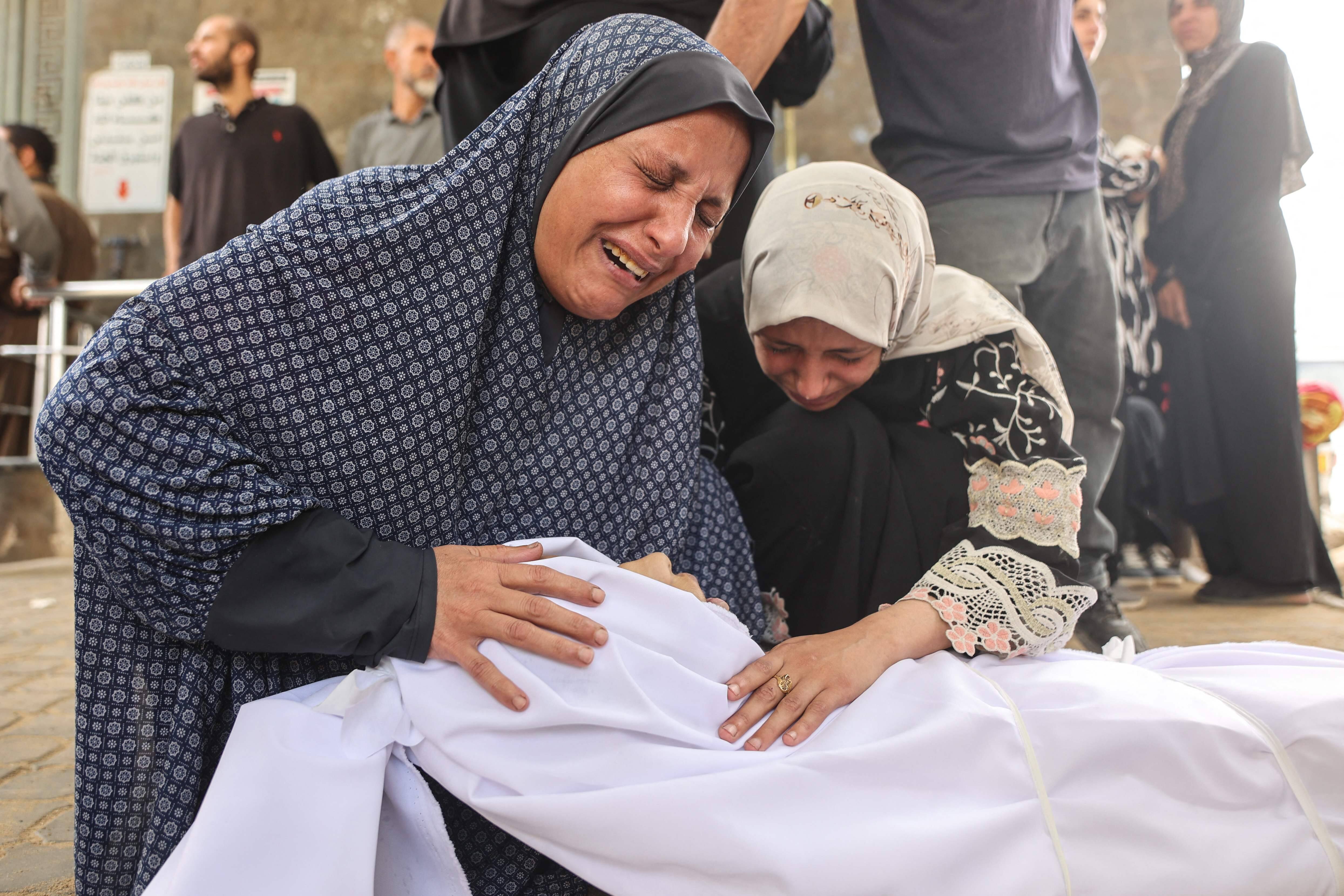 Mulheres, com os rostos cheios de dor, inclinam-se sobre pequenos corpos caídos no chão em Khan Younis, no sul da Faixa de Gaza, lamentando a morte de dois dos seus filhos durante uma nova vaga de ataques israelitas.