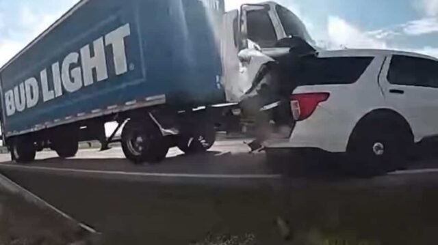 Uma perseguição em alta velocidade envolvendo um trailer roubado de um trator Bud Light e a polícia em Indiana terminou em um acidente violento quando o caminhão bateu em um carro patrulha.