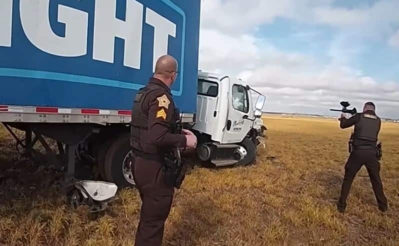 A cena foi capturada pela câmera corporal da polícia. A filmagem mostra a polícia cercando o caminhão, usando spray de pimenta e mandando o motorista sair.