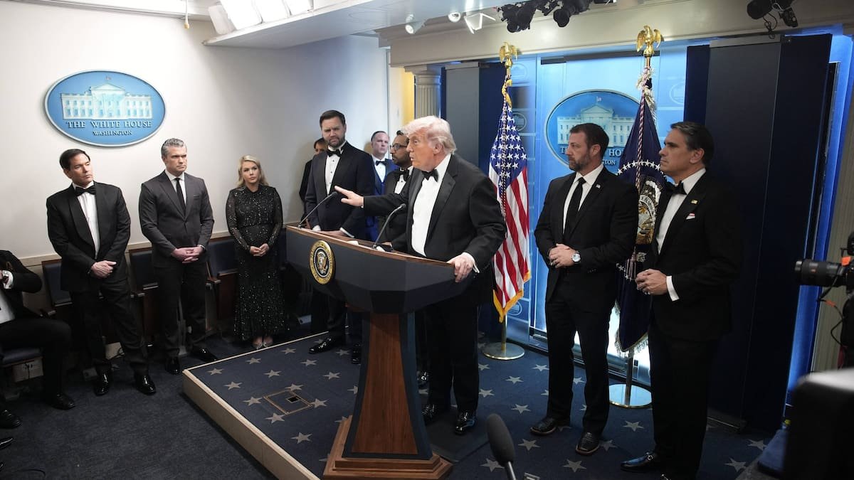 Num vídeo da AFP, podemos ver o presidente Trump sentado à mesa principal com o seu vice-presidente, J.D. Vance, e a sua porta-voz, Karoline Leavitt, entre outros, enquanto ressoam batidas abafadas, inicialmente sem causar qualquer reação.