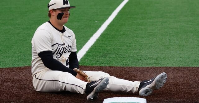 Obviamente, fotos de momentos não tão bons para os tigres não são muito divertidas de assistir, mas este é um momento um tanto engraçado. Woita tentou fazer uma jogada no início, mas o corredor foi considerado seguro e ele apenas ficou sentado aqui para um golpe. Isso me lembrou muito da foto que tirei do Marquês Johnson no jogo contra a Louisiana em setembro!