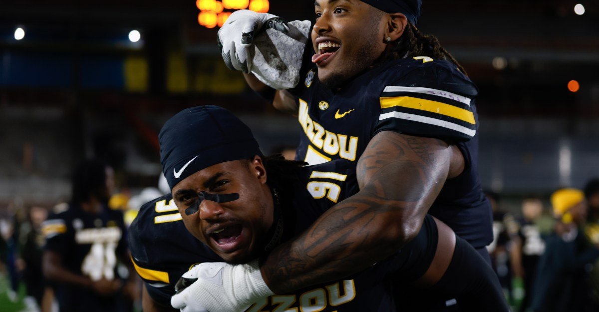 O tackle defensivo do Missouri, Chris McClellan, levanta sua pedra enquanto é carregado pelo campo pelo companheiro de equipe Elias Williams, sábado, 15 de novembro de 2025, no Faurot Field, em Columbia.