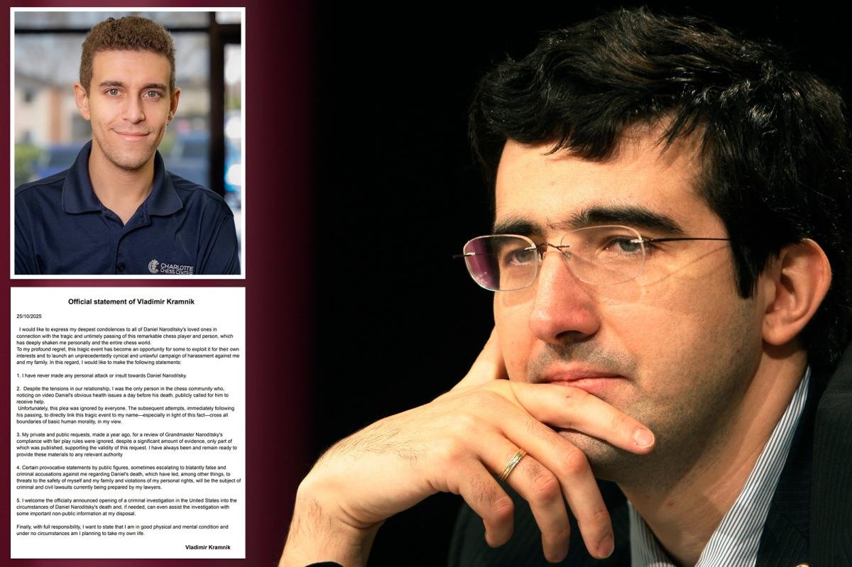 O grande mestre do xadrez russo, Vladimir Kramnik, nega a responsabilidade pela trágica morte de Daniel Naroditsky e redobra as alegações de trapaça que supostamente levaram o prodígio do xadrez americano a uma espiral mortal.