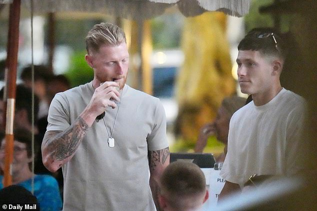 Ben Stokes (à esquerda) e seu companheiro de equipe Matthew Potts são retratados durante o intervalo da equipe em Noosa, na Sunshine Coast de Queensland, que agora é objeto de uma investigação da equipe