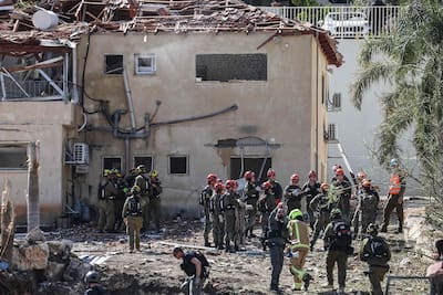 Equipes de resgate e forças de segurança trabalhavam ao redor de uma casa destruída cujas telhas foram destruídas, deixando apenas uma carcaça nua.
