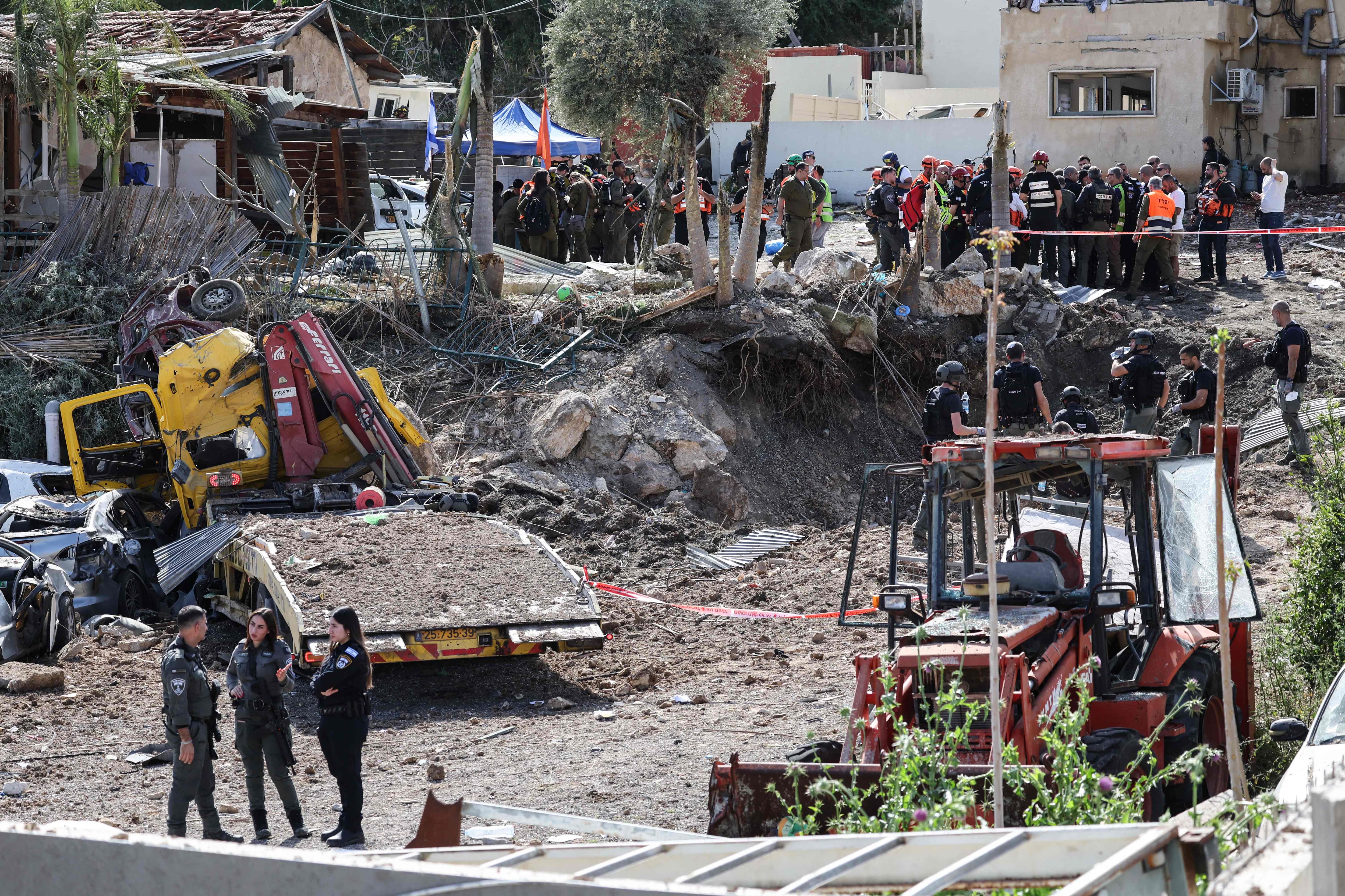 Equipes de resgate e forças de segurança trabalhavam ao redor de uma casa destruída cujas telhas foram destruídas, deixando apenas uma carcaça nua.