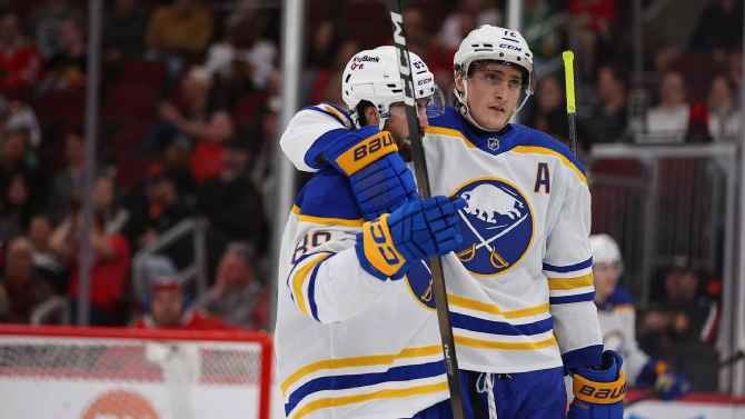 Tage Thompson marca duas vezes na vitória dos Sabres sobre os Blackhawks para conquistar o título da Divisão do Atlântico.