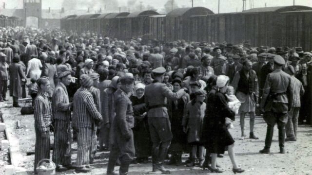 Uma fotografia tirada em Oswiecim em 27 de maio de 1944, mostrando nazistas selecionando prisioneiros na plataforma na entrada do campo de extermínio de Auschwitz-Birkenau. (Foto: -/Arquivos Yad Vashem/AFP via Getty Images)
