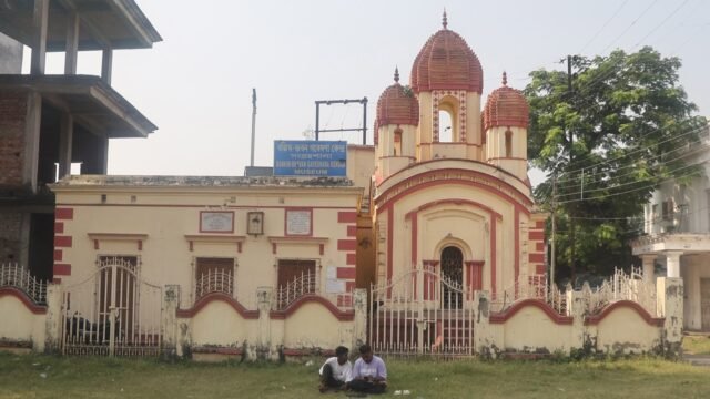 Este edifício de um andar vermelho e bege com cúpulas shikhara e portas em arco em Kantalpara, Naihati, é o ‘Baithakkhana’ de Bankim Chandra Chattopadhyay – o salão de três salas onde o escritor, poeta, ensaísta e jornalista do século XIX escreveu Vande Matarni 150 anos este ano.