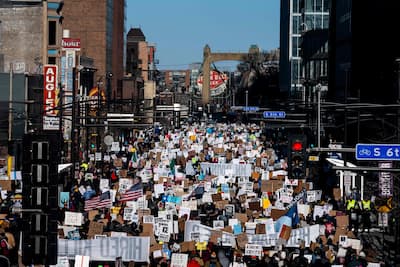Milhares de manifestantes marcharam pelas ruas de Minneapolis na sexta-feira para denunciar as políticas do governo Trump, que prendeu uma ex-âncora da CNN por sua cobertura de operações e eventos da polícia de imigração.