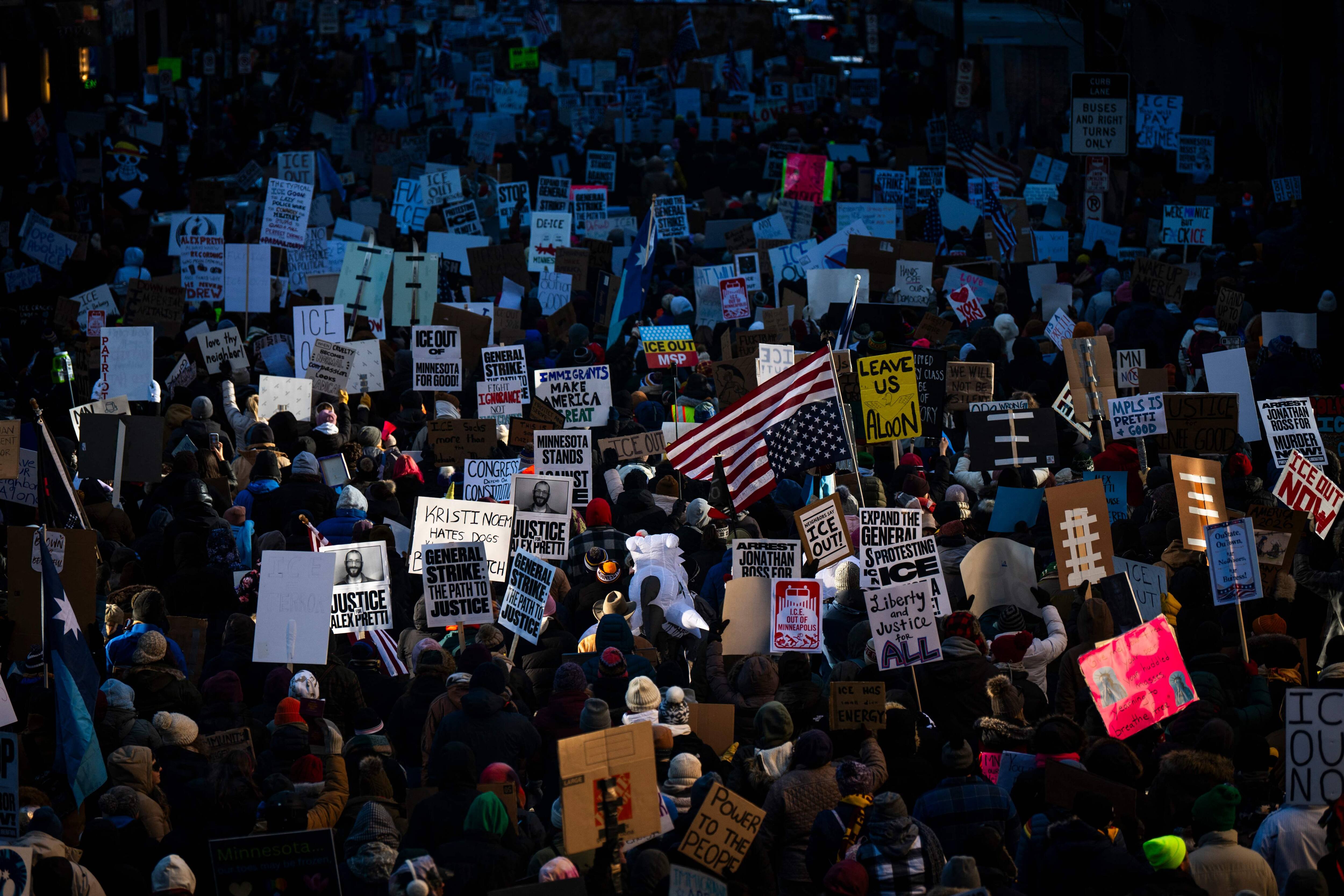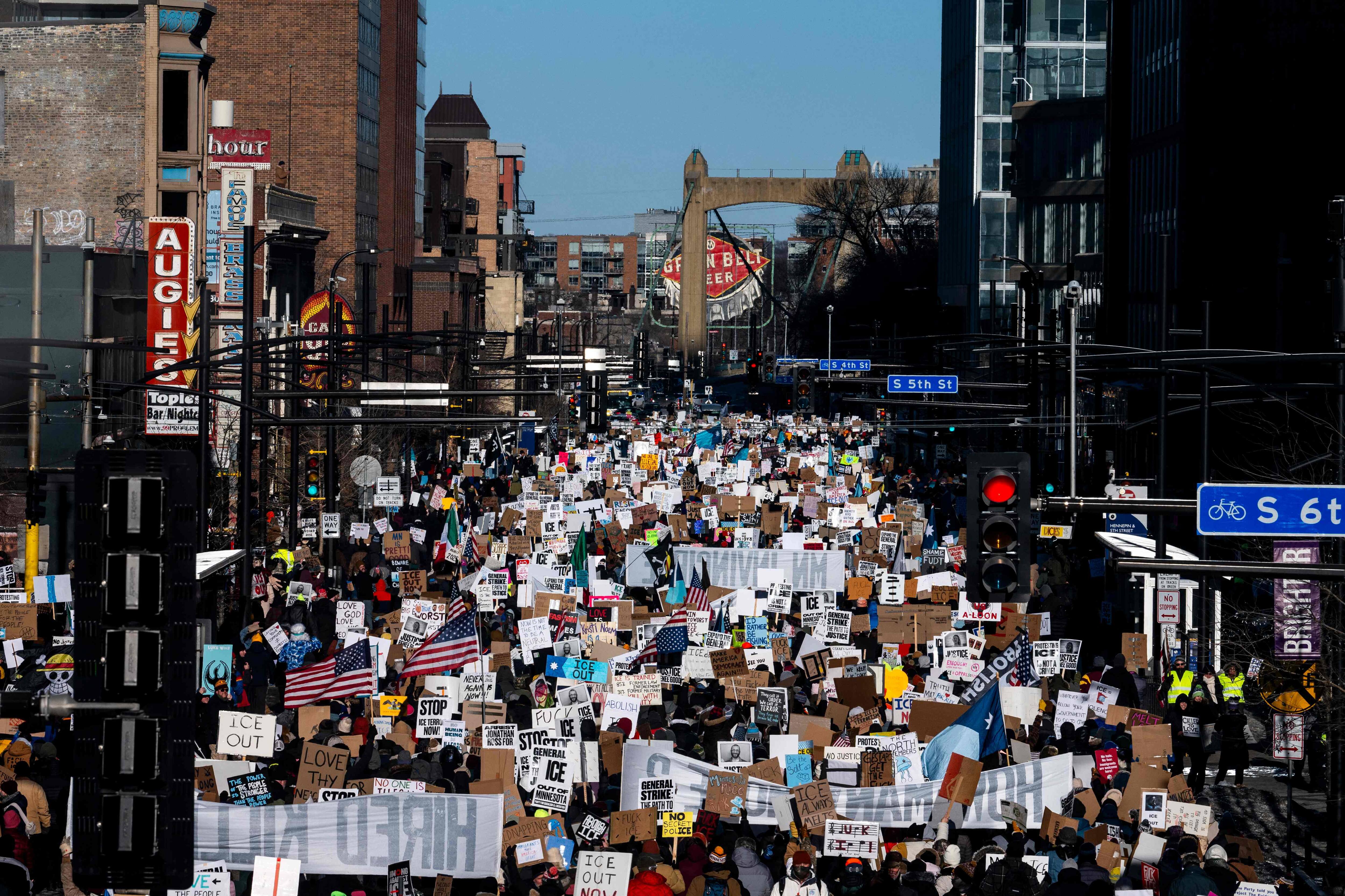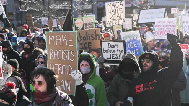 Milhares de manifestantes marcharam pelas ruas de Minneapolis na sexta-feira para denunciar as políticas do governo Trump, que prendeu uma ex-âncora da CNN por sua cobertura de operações e eventos da polícia de imigração.