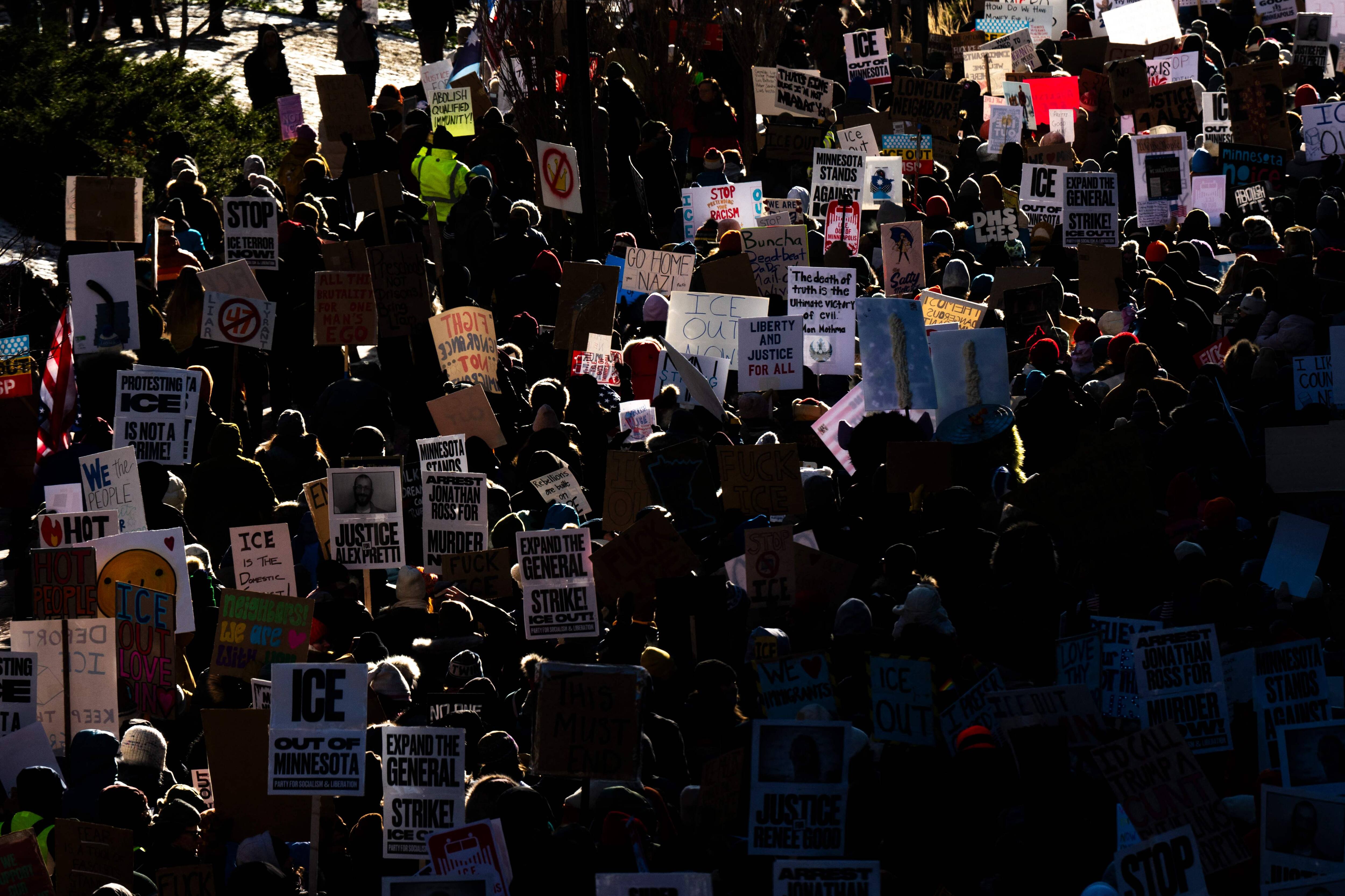 Apesar do destacamento ainda pesado de agentes federais que deverá representar o giro do parafuso, milhares de manifestantes saíram às ruas na sexta-feira sob cartazes hostis tanto ao próprio Donald Trump como ao ICE, a força policial federal de imigração que destacou ainda mais as tensões.